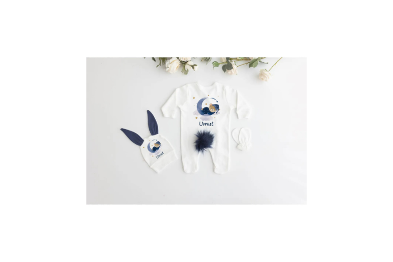 %100 Pamuk Baskılı Tavşanlı 11’li Isimli Organik Lacivert Tavşanlı Bebek Hastane Çıkışı