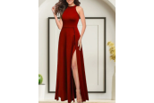 Serero Kadınhalter Yaka Derin Yırtmaç Detaylı Tam Boy Ithal Krep Abiye Elbise